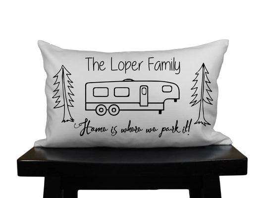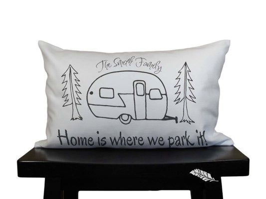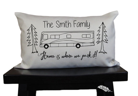 Personalized RV pillow Trailer Camper decor Home is where we park it camping pillow. happy camper gift motorhome traveler snowbird retiree